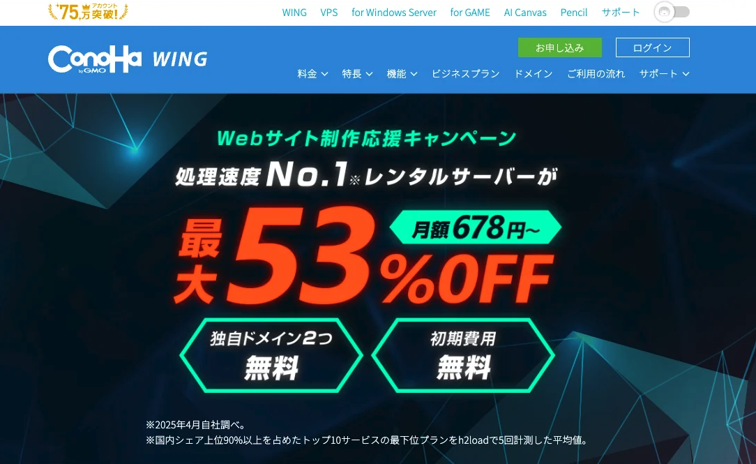 ConoHa WINGは、速度・コスパ・使いやすさのすべてを兼ね備えた、2025年現在最もおすすめできるレンタルサーバーです。